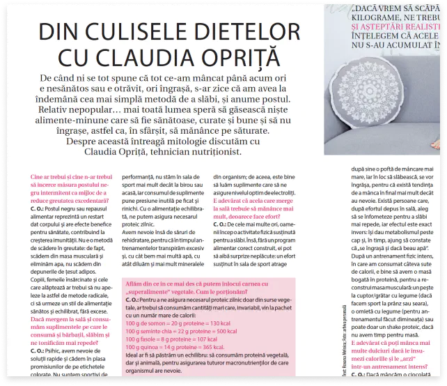 “Claudia Opriță scrie percutant și la obiect și știe să răspundă cu finețe celor mai delicate întrebări care țin de obiceiurile noastre de viață! Informația completă și vibrația bună sunt atuurile pe care i le-am remarcat în cadrul colaborării noastre în revistele de femei. Mult succes în continuare, Claudia!”